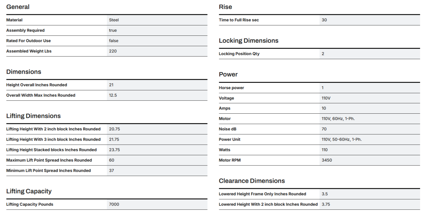 Strong, Stable Lifting PowerModels range from 3, 500 to 8,000 lbs. capacity, builtfrom heavy-duty 14-gauge steel frames withautomatic safety locks for complete peace of mind